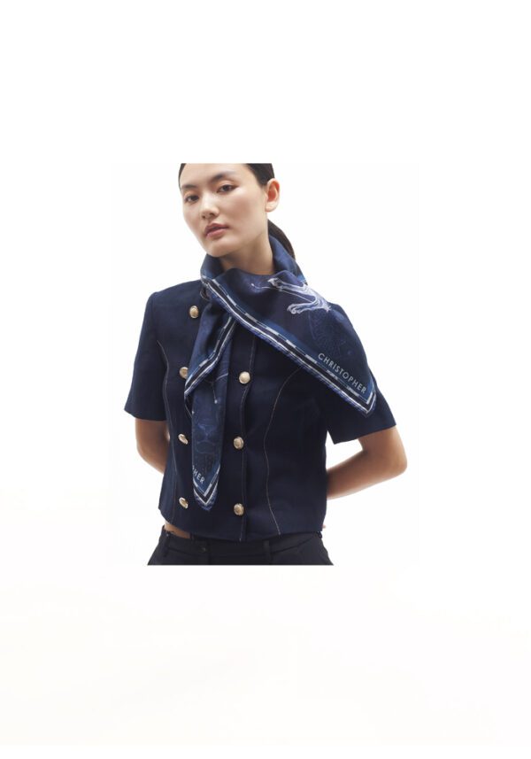 Swaying cosmic forms on fluid silk, this midnight hued scarf channels subdued strength and modern grace. Featuring celestial abstract print and featherlight texture, it adds a touch of the charm to urban power dressing.