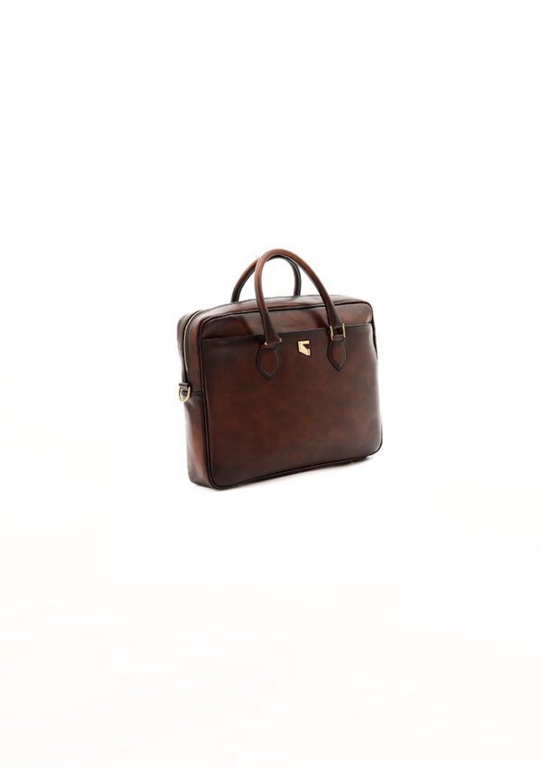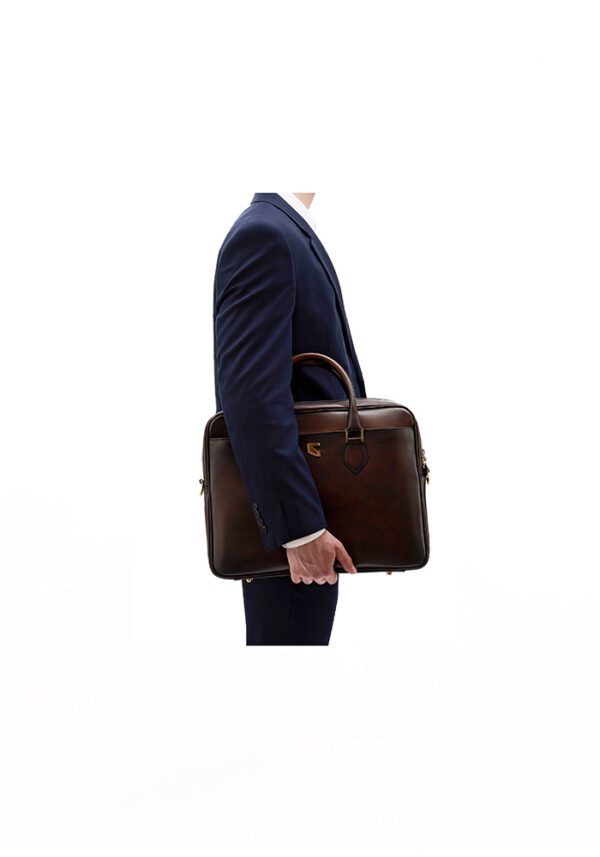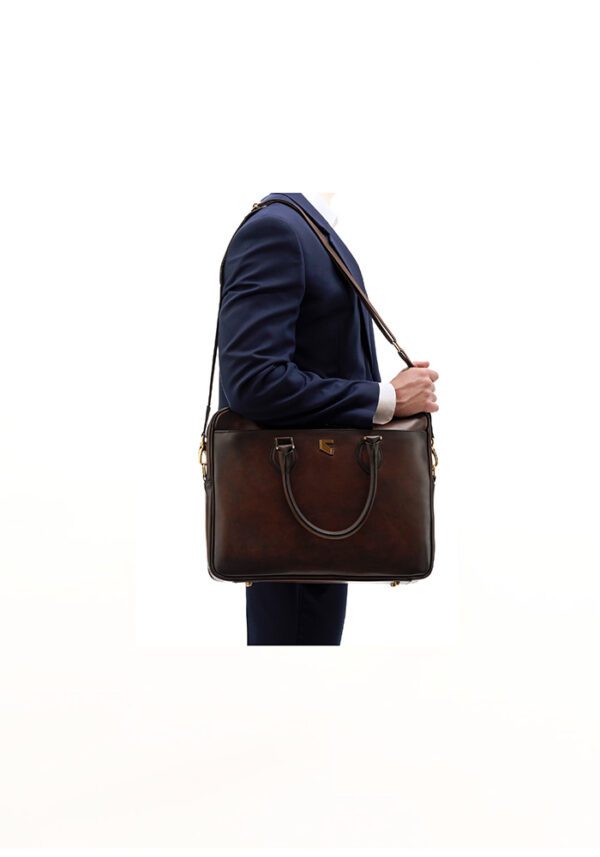 Designed in flawless calf leather, the Broker Bag in espresso hue features a signature small metal logo detail, structured flap design and sturdy top handles. An urban bag that blends functionality with contemporary elegance.