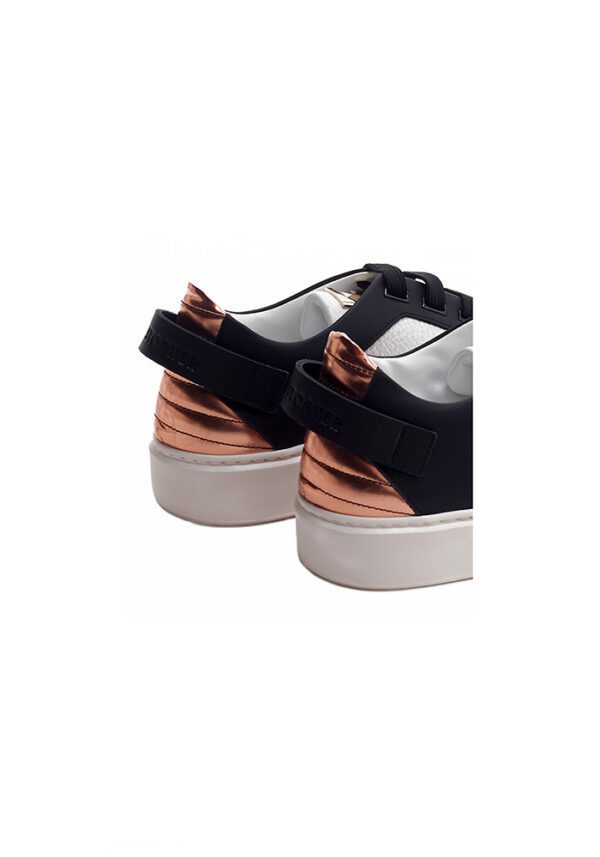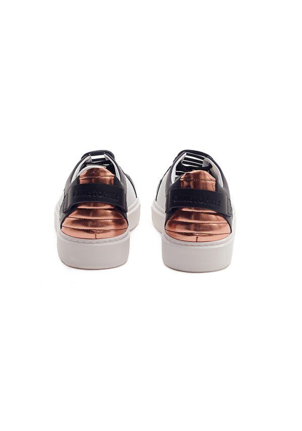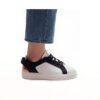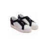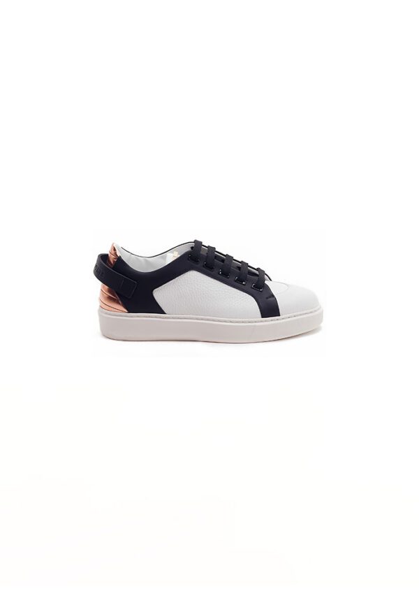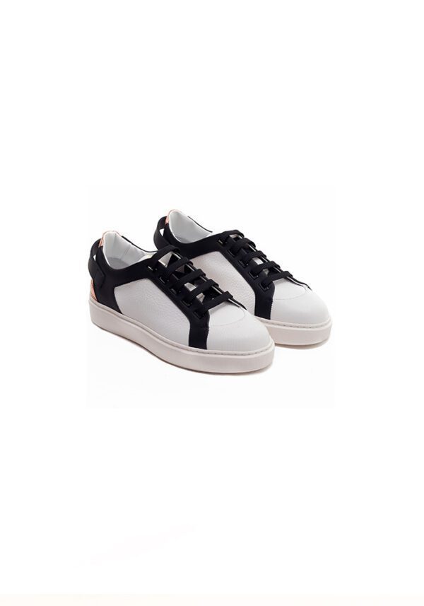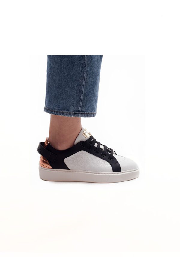 Frostline Sneaker is curated in textured grain calf leather, designed for the modern woman. The crisp white upper is contrasted with bold black side accents and laces, while a polished metal logo.