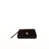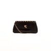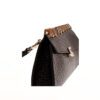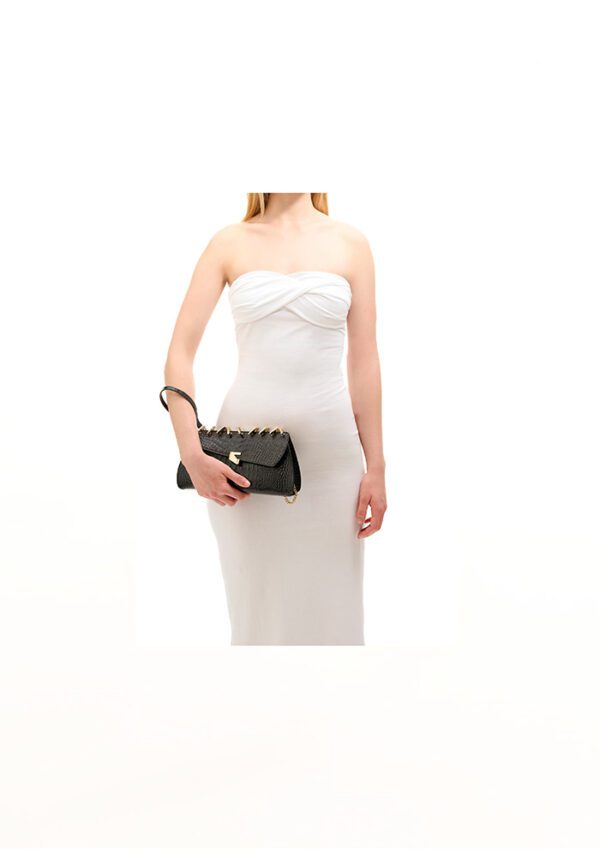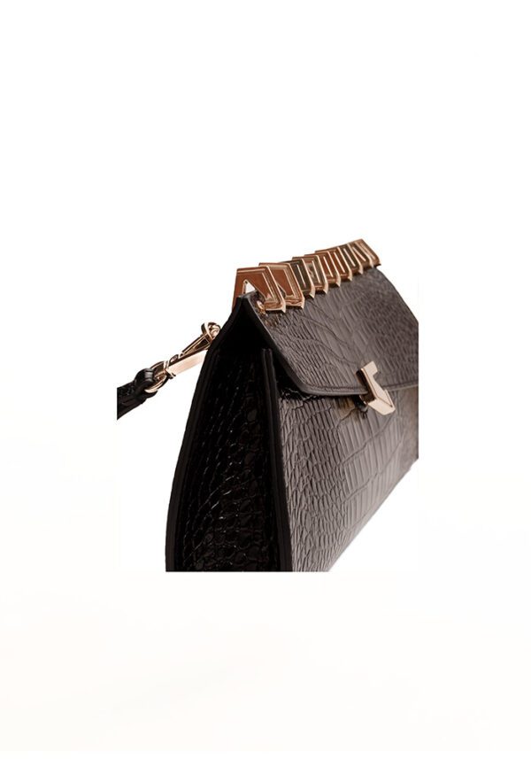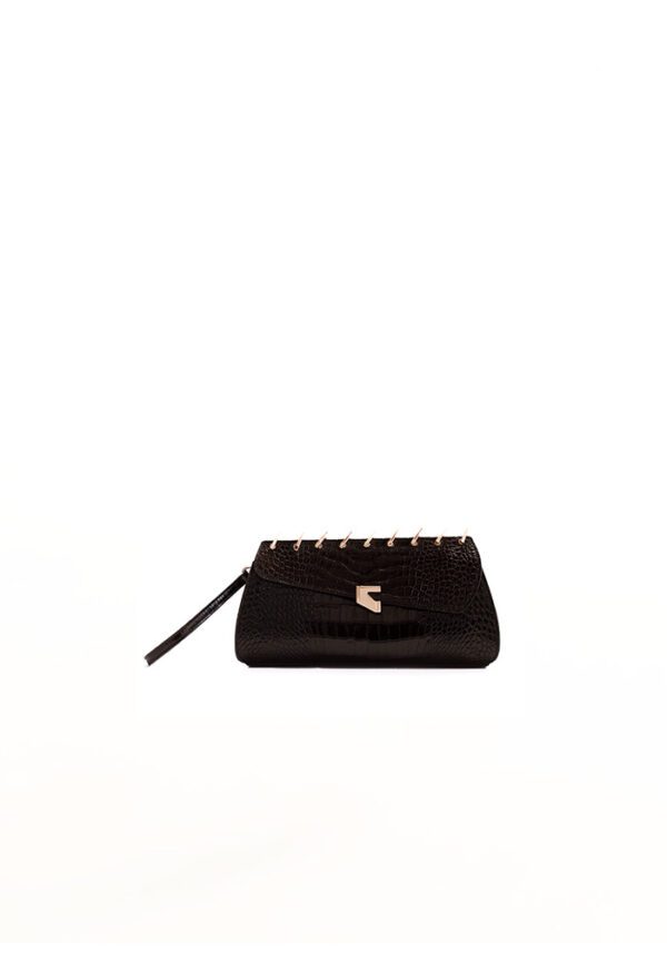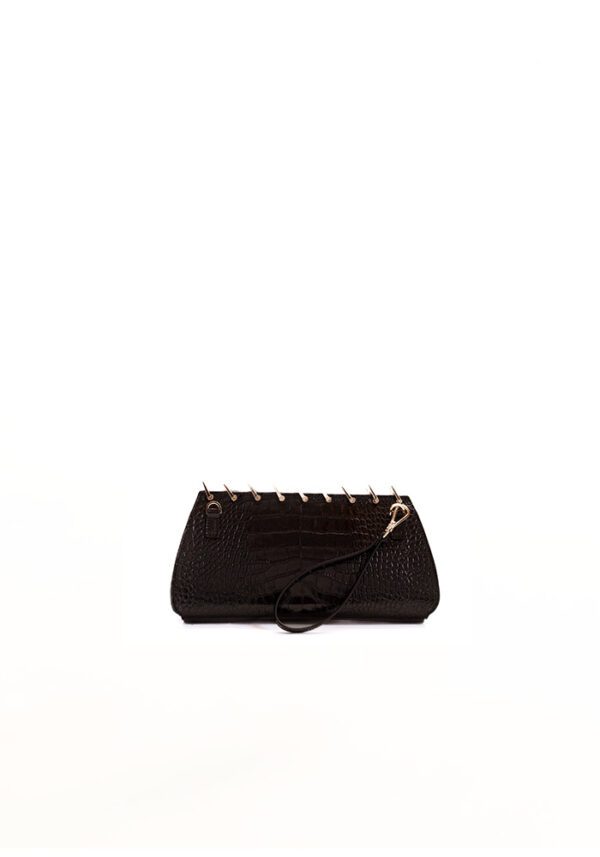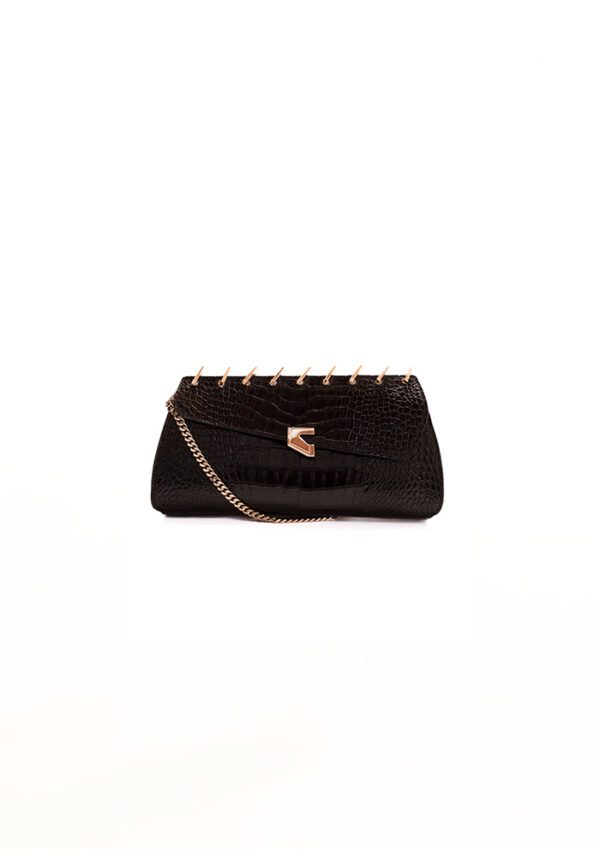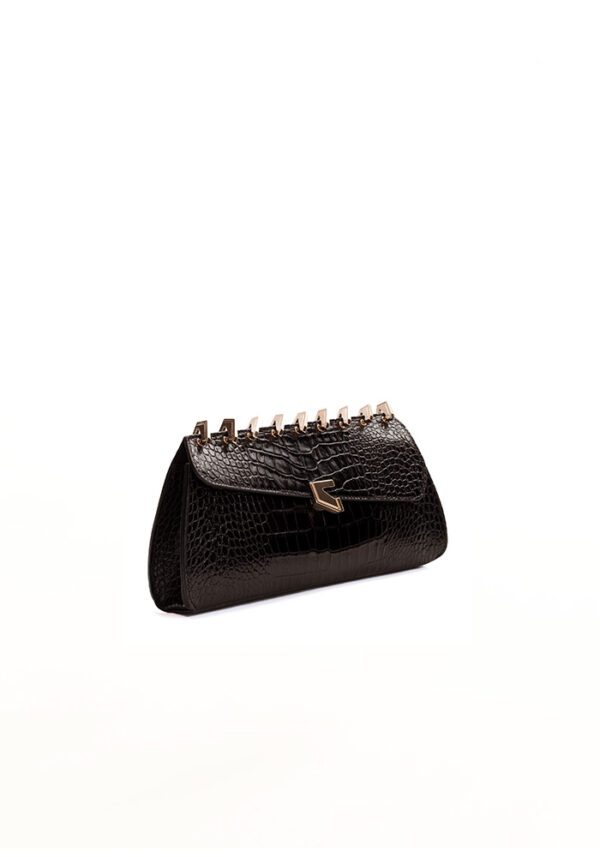The Jawsome Clutch is designed with premium calf leather with a refined black crocodile effect texture. This compact yet impactful clutch features a sculptural gold tone jaw inspired detailing along the top edge, adding a statement finish. Featuring a gold chain strap for versatile wear, the clutch is adorned with a sleek metal logo.