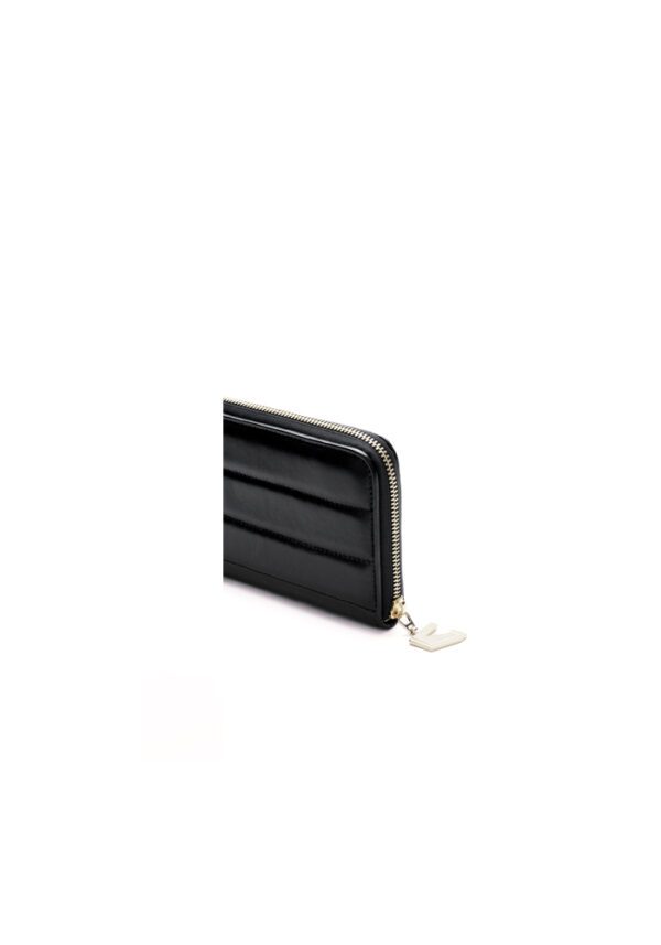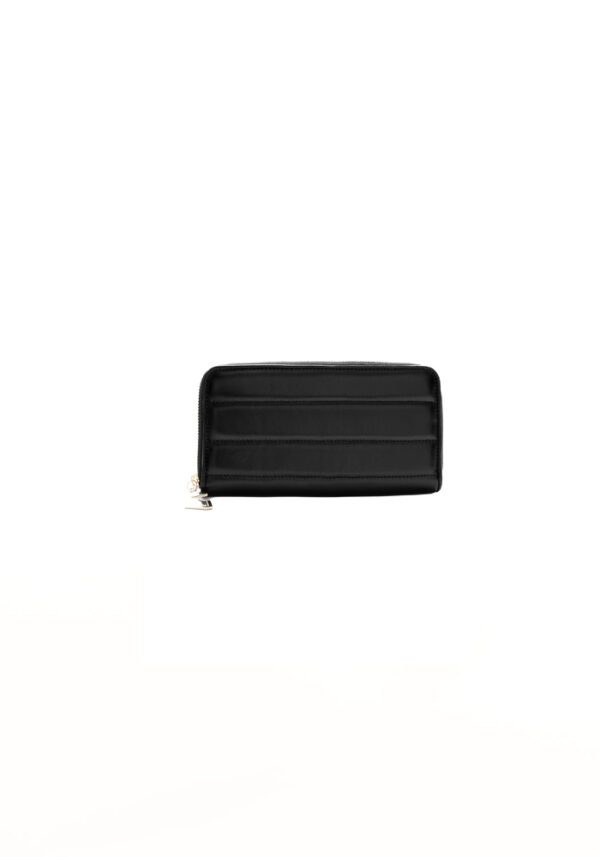 The Luna Line Wallet is crafted in premium black calf leather, featuring quilted-style line detailing for a sleek and structured look. Designed with an inner zip compartment, it offers secure functionality while maintaining a subtle and compact shape.