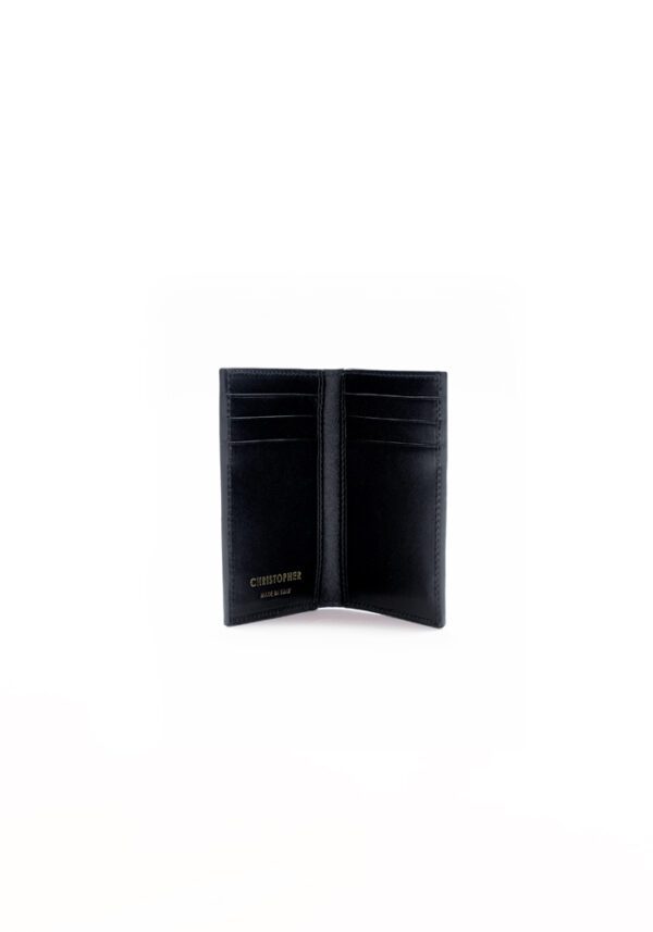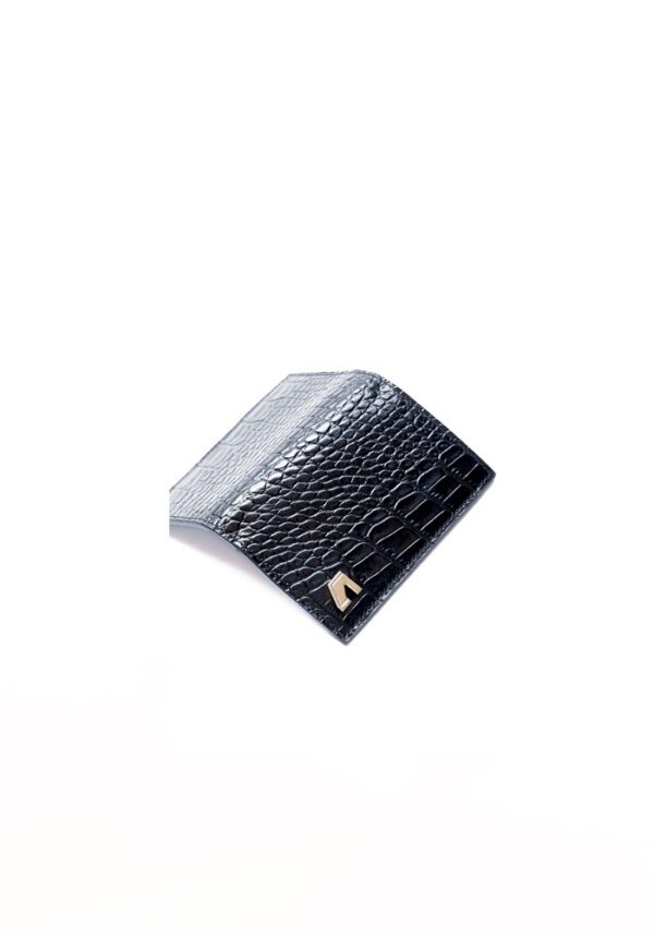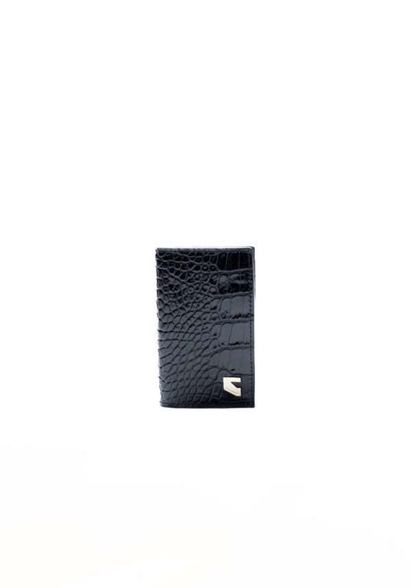 Compact bifold wallet for men in calf leather, featuring a glossy black croco-embossed finish. Enhanced with polished metal logo detailing at the bottom, the wallet offers a sleek and refined look for everyday sophistication.