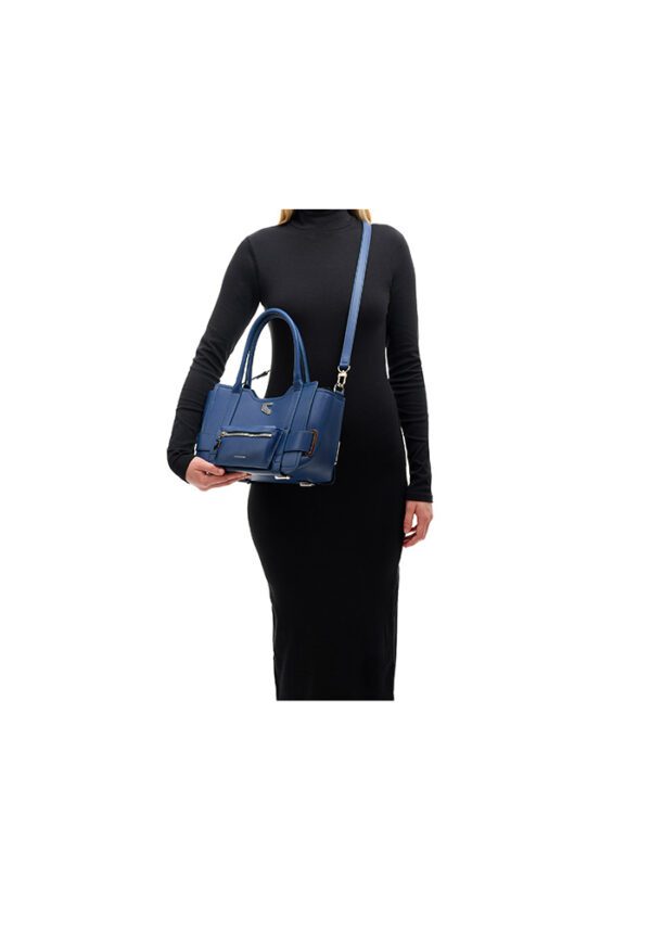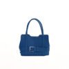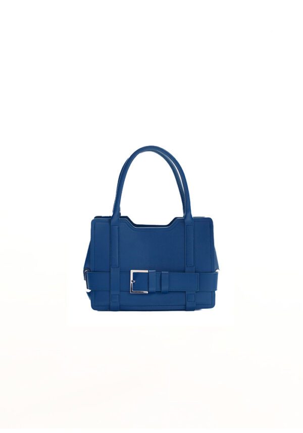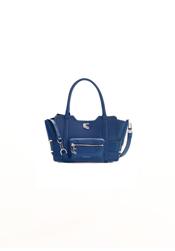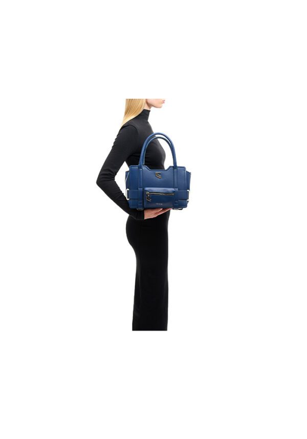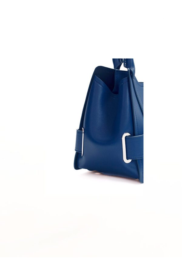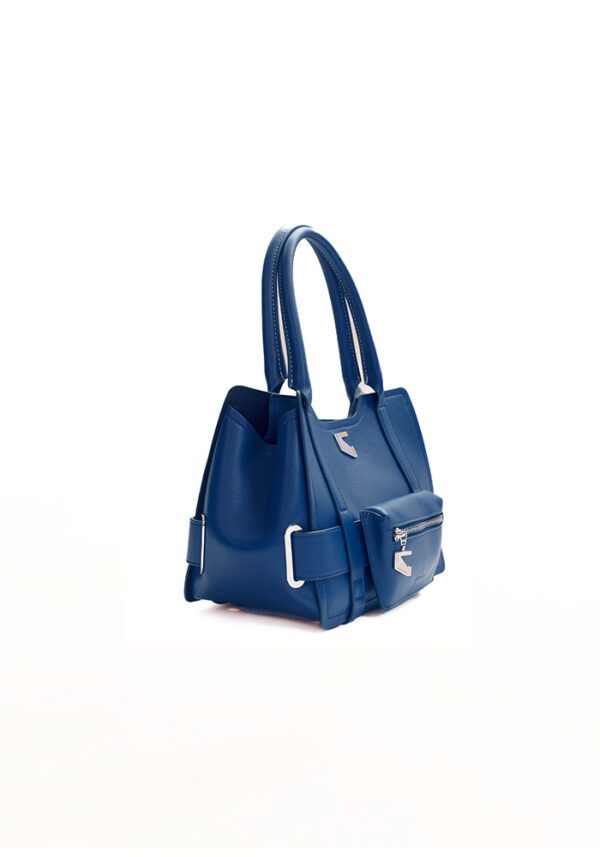 The Denim Dusk Tote in calf leather strikes the apt balance between structure and style. Designed with a top handle and detachable crossbody strap, the medium sized tote features a front zip pouch, side buckle +detailing, and a signature metal logo, making it compact yet spacious.